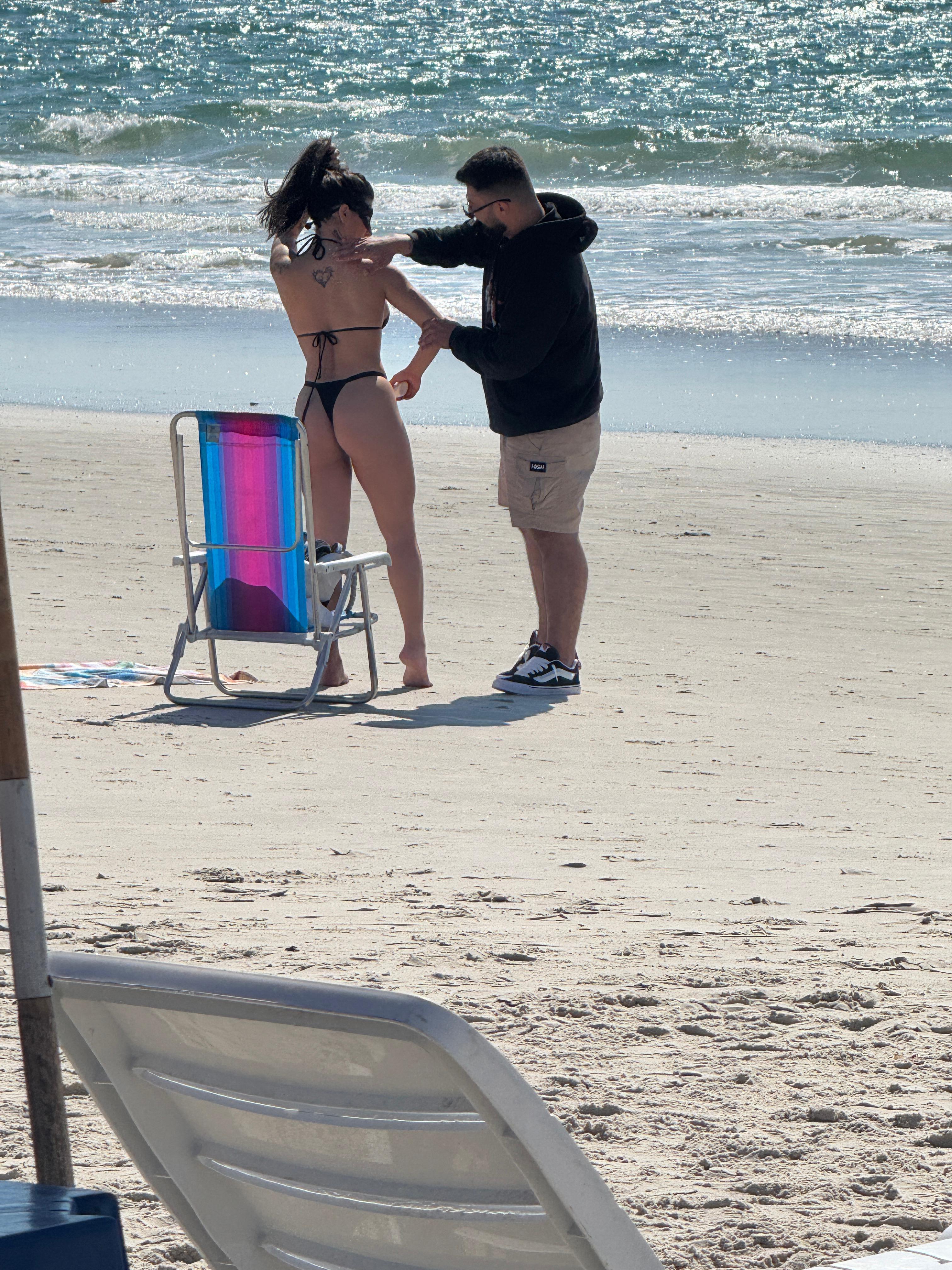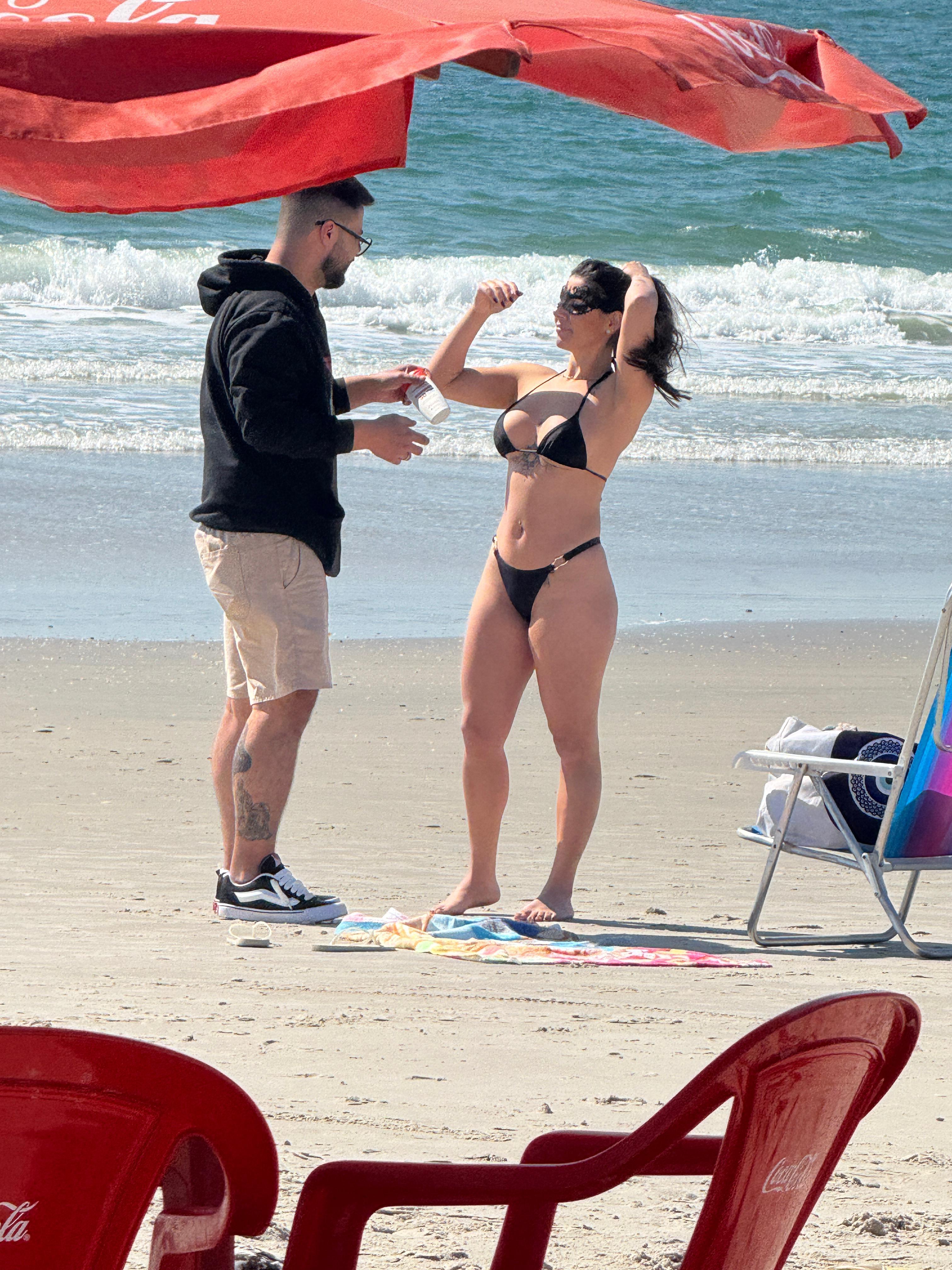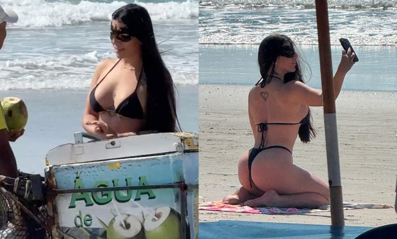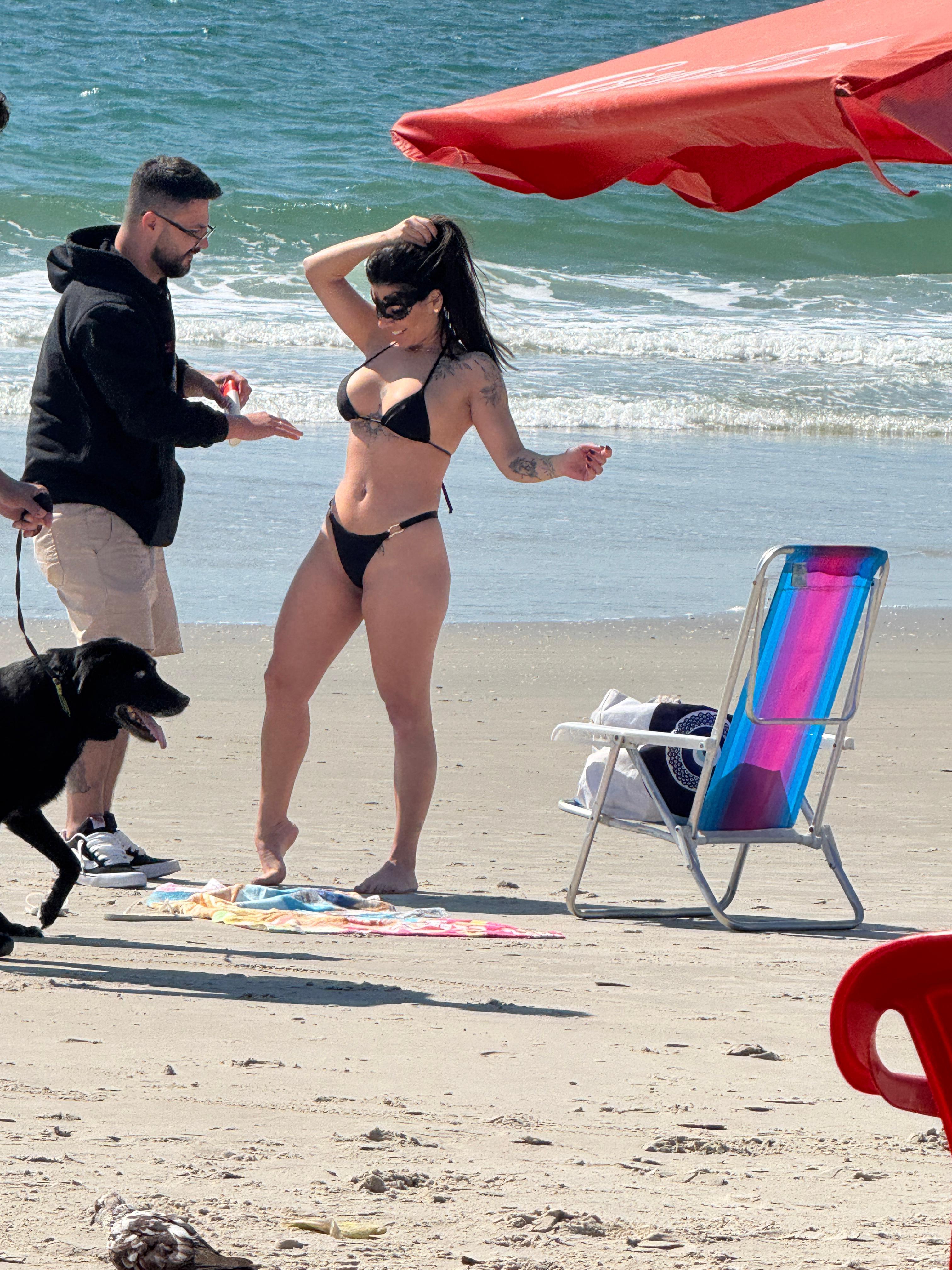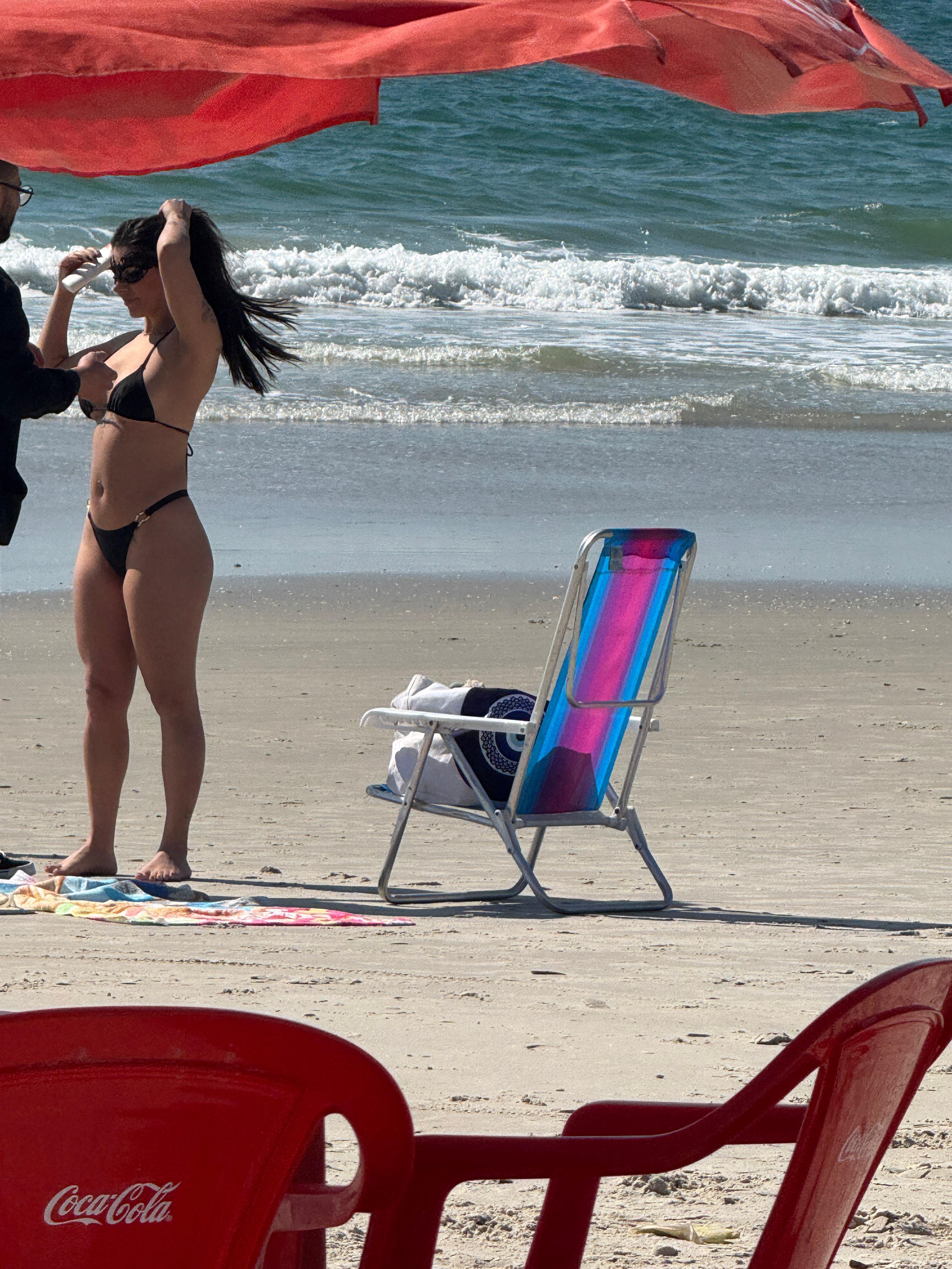 A mulher chegou acompanhada, estacionou o carro discretamente, fez uma troca rápida de roupa no próprio veículo e, em seguida, e se esticou na areia. Durante duas horas, tomou sol, pediu bebidas em barraca próxima, entrou no mar e manteve a postura de quem parecia não se importar com os olhares curiosos.