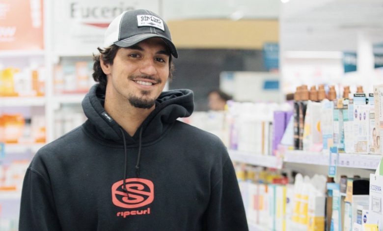 Entre uma loja e outra, Medina parou na farmácia Droga Raia, onde aproveitou para renovar o estoque de produtos pessoais. Sempre simpático, o tricampeão mundial de surfe atendeu fãs que o reconheceram no local — posou para fotos e distribuiu autógrafos com bom humor.